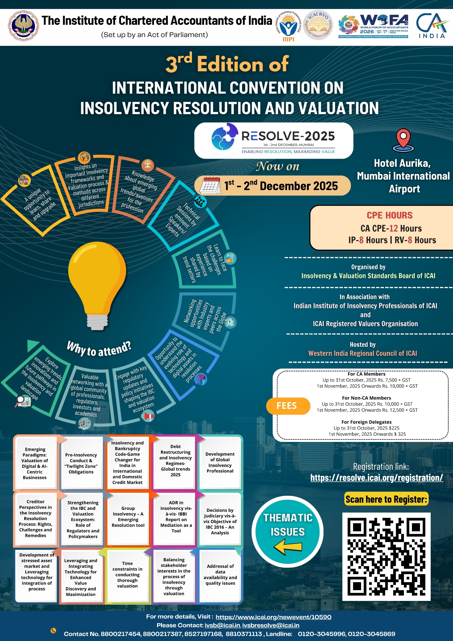 - 3rd Edition of International Convention on Insolvency Resolution and Valuation “RESOLVE-2025” on 1st & 2nd December 2025 at Hotel Aurika, Mumbai.