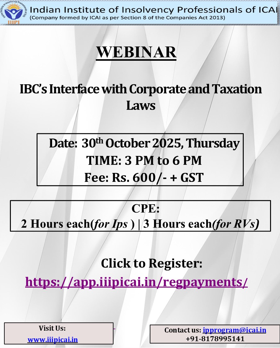 - Webinar on “IBC Amendment Bill 2025-Debate (PART 2)” on 22nd August 2025 from 03.00PM to 06.00PM.
